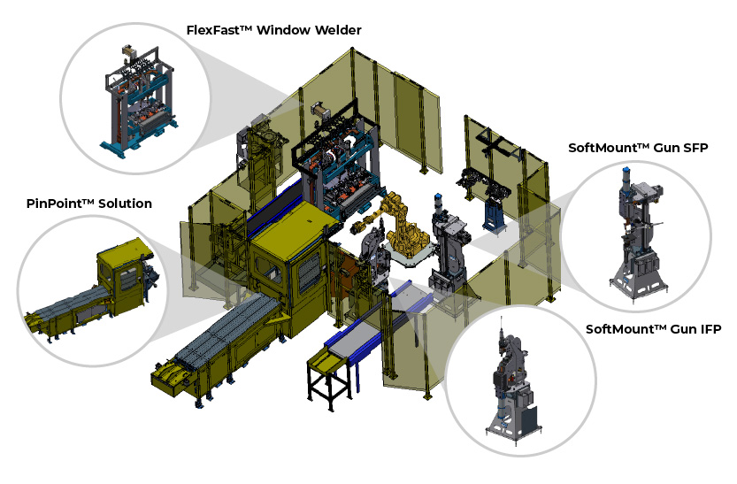 Die High Speed Fastener Solution™ (HSFS) von CenterLine ist eine konfigierbare Schweißzelle, die aus verschiedenen CenterLine-Produkten besteht. Diese können eine oder mehrere der folgenden Produkte enthalten: PinPoint™ Solution, SoftMount™ Gun, und FlexFast™ HD Window Welder.